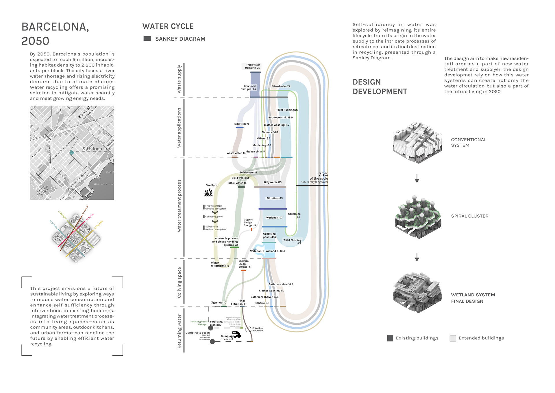 The Sankey diagram became the core analytical tool for understanding complex water relationships across scales — from individual housing units to neighborhood networks. This visualization method revealed hidden inefficiencies and potential symbiotic relationships between different water uses, enabling the design of closed-loop systems that transform waste into resources.